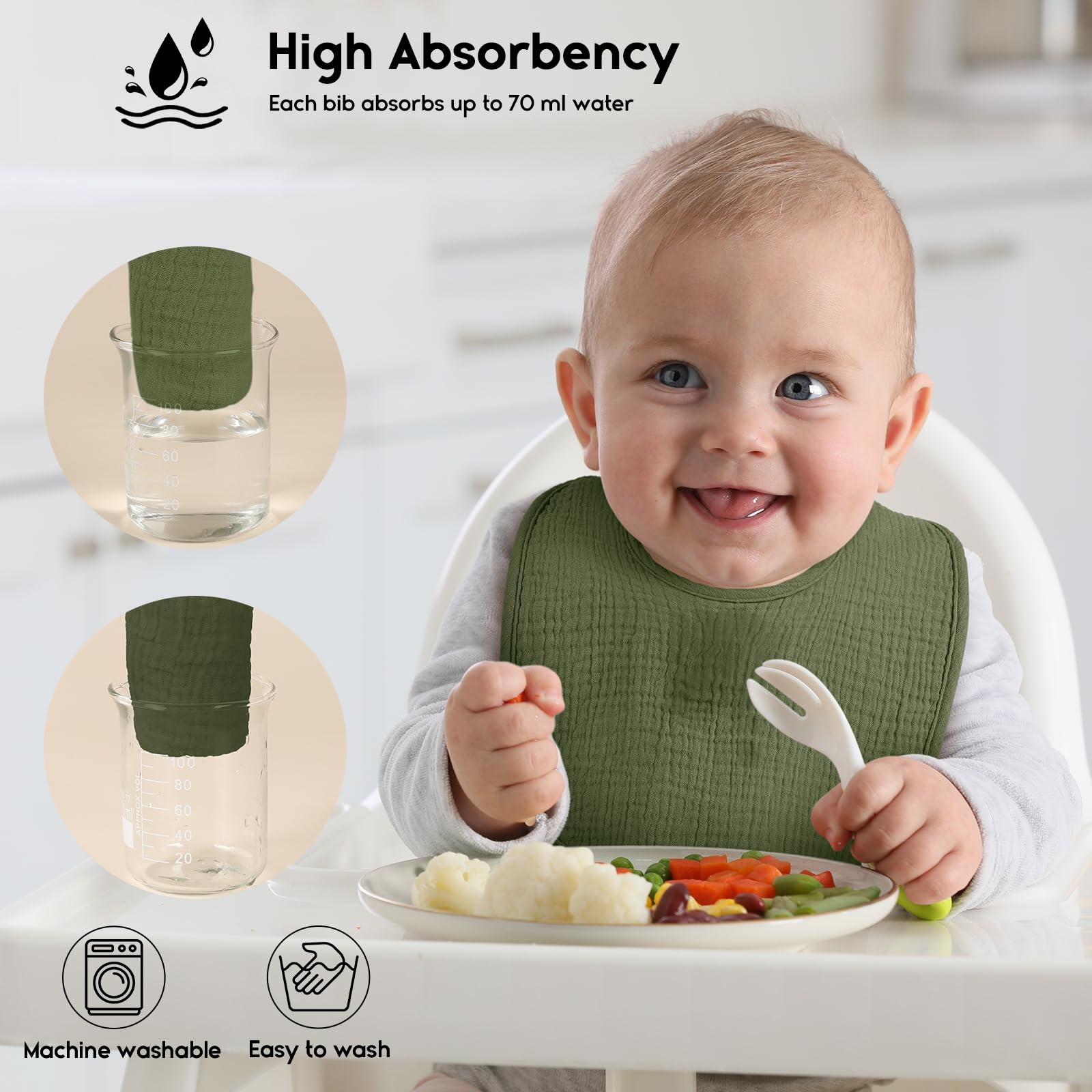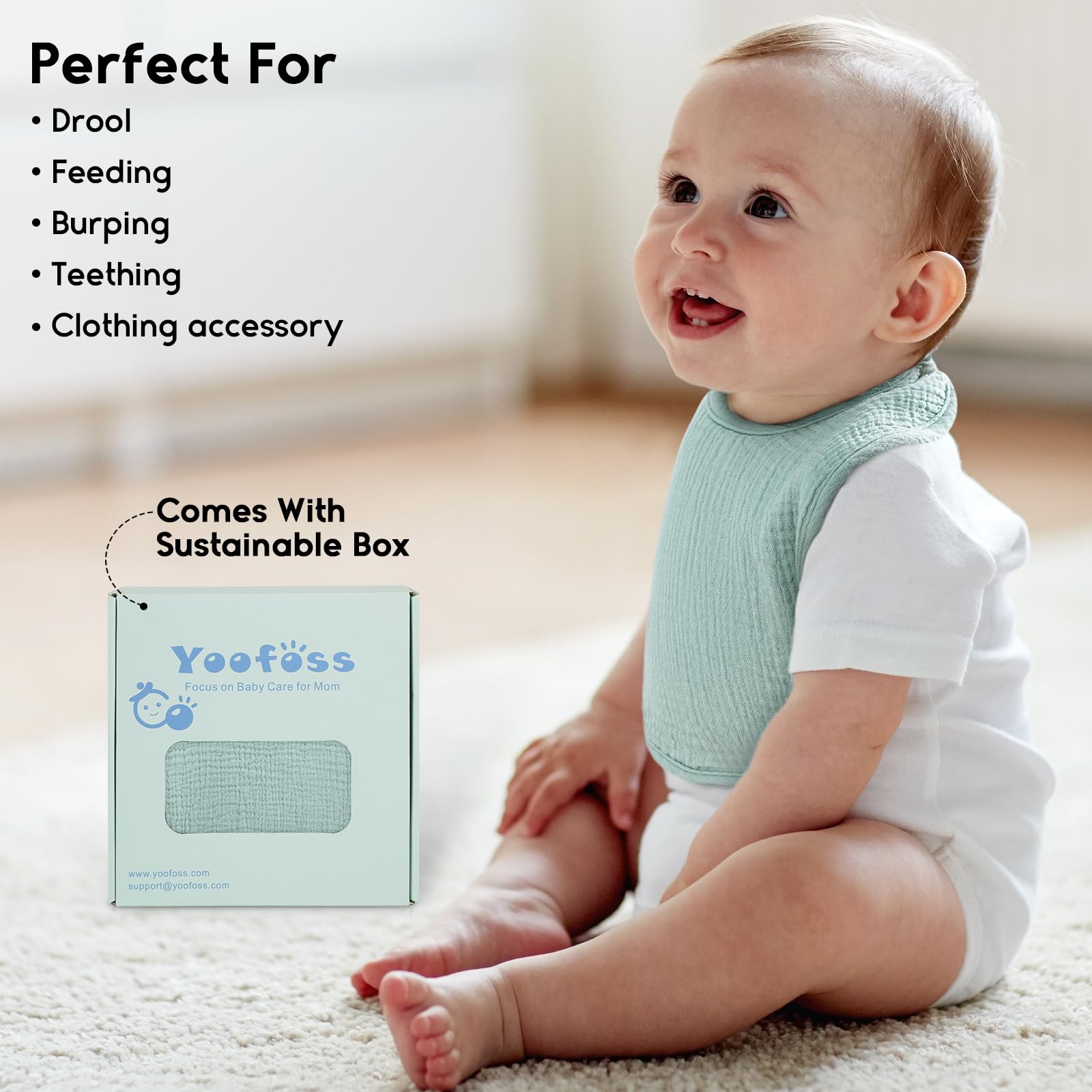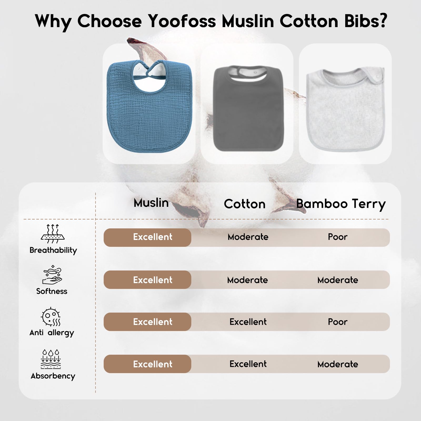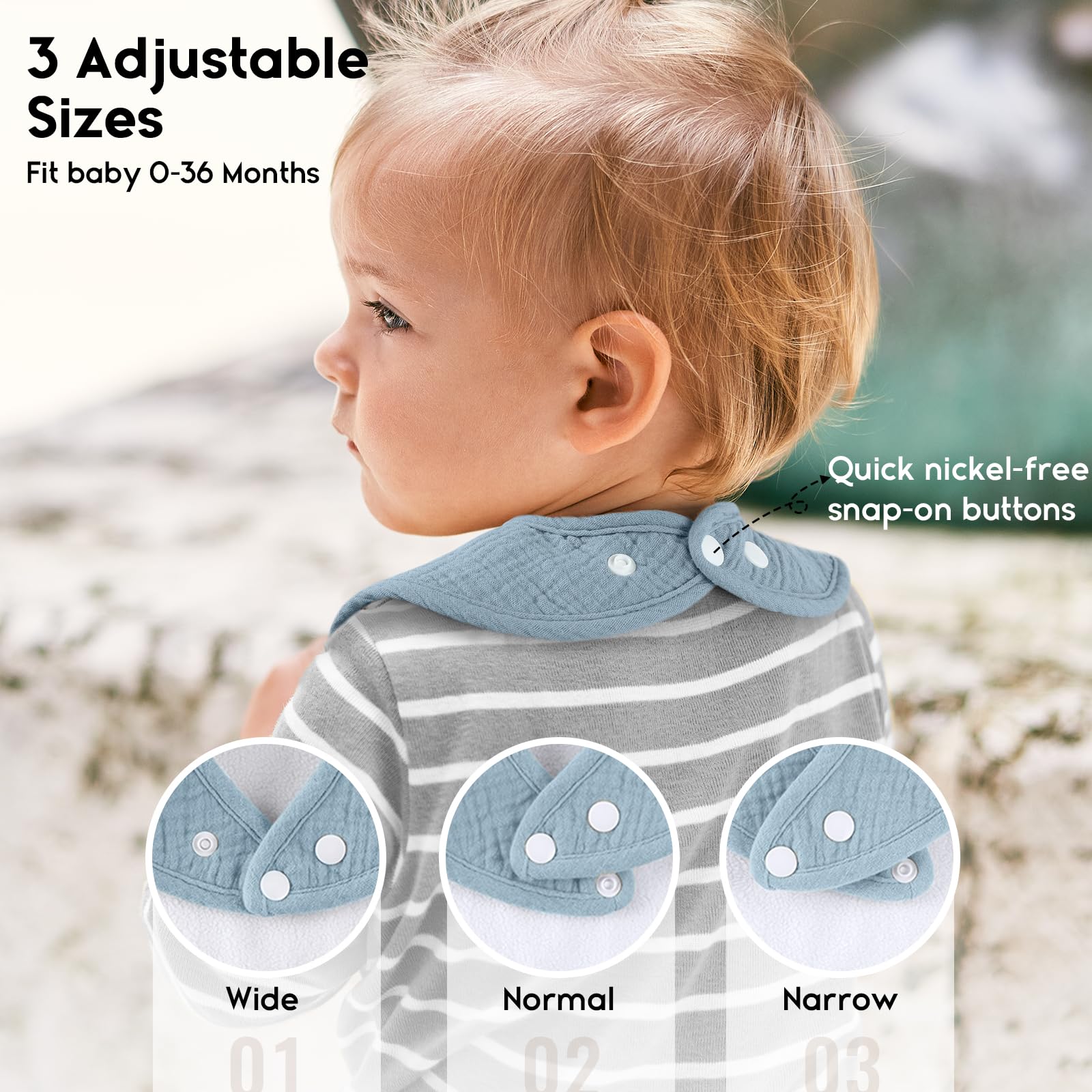 - Soft Muslin Cotton Bibs: The front layer of our baby bibs are made of muslin cotton, prioritizing the comfort of your baby's sensitive skin. The back layer is polyester fleece which provides high absorbency to quickly collect and absorb liquids to keep your baby dry and comfortable all day.