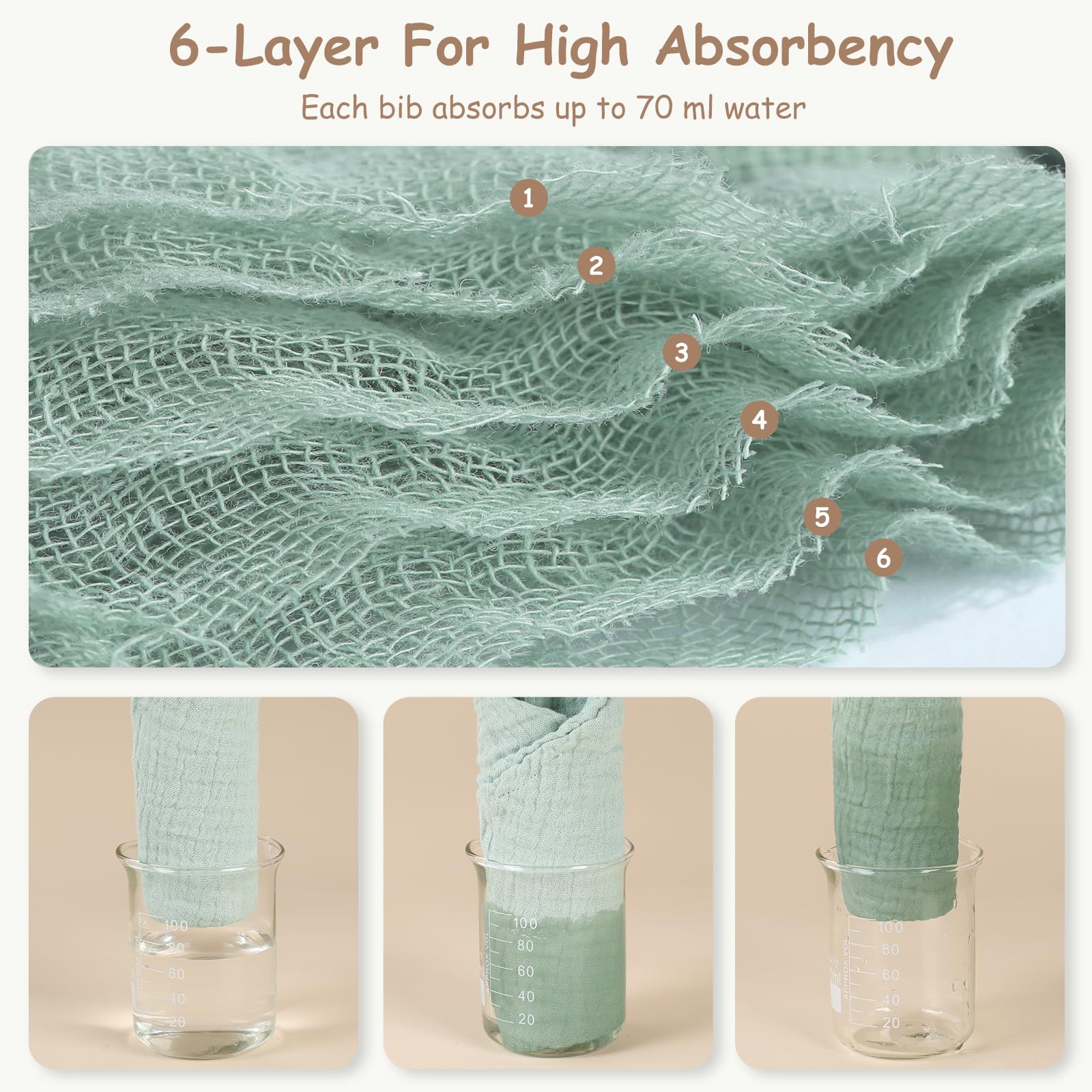 - Super Absorbent : 6 layers of thickened muslin bibs have super absorbency. Each muslin baby bibs can absorb 70ML of clean water. Even if your baby is a heavy drooler, it can be completely absorbed by these bibs, keeping your baby's clothes dry all day long.