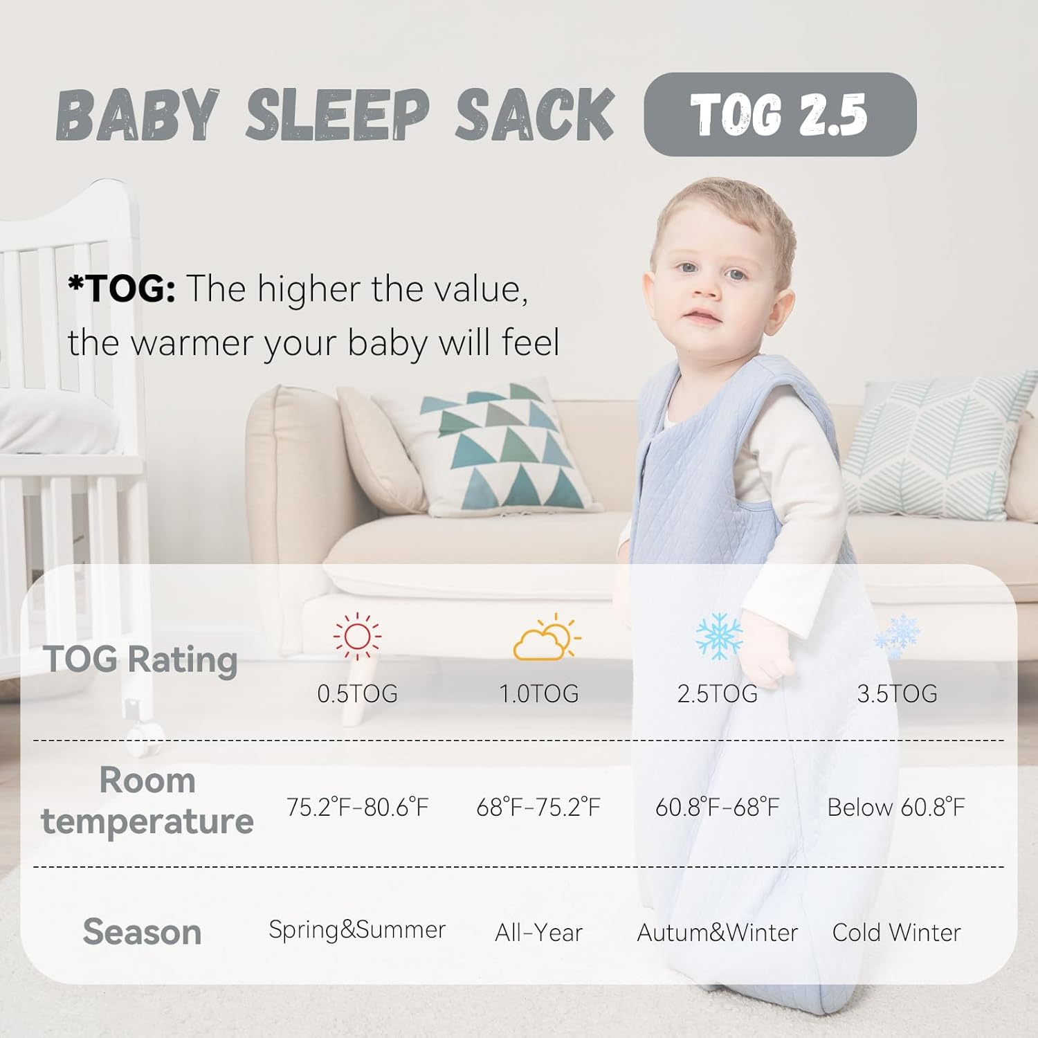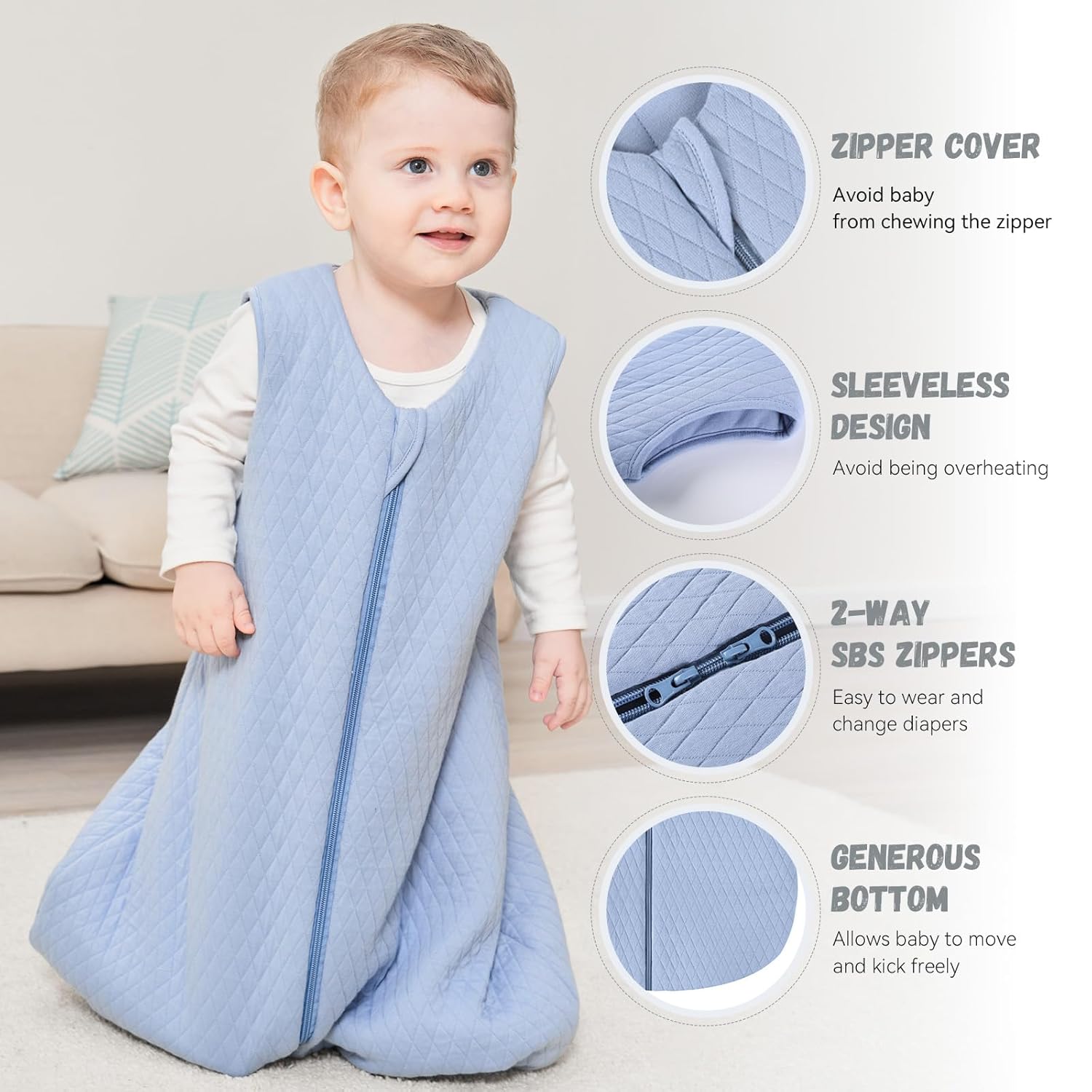 • Warm and Cozy - This baby sleep sack made with 100% cotton fabric and fluffy polyester filling, super-soft and breathable for comfort. TOG 2.5 sleep sack is ideal for cooler weather. 3-layer breathable material and sleeveless design helps regulate baby's temperature, reducing overheating risk and ensuring warmth and cozy.