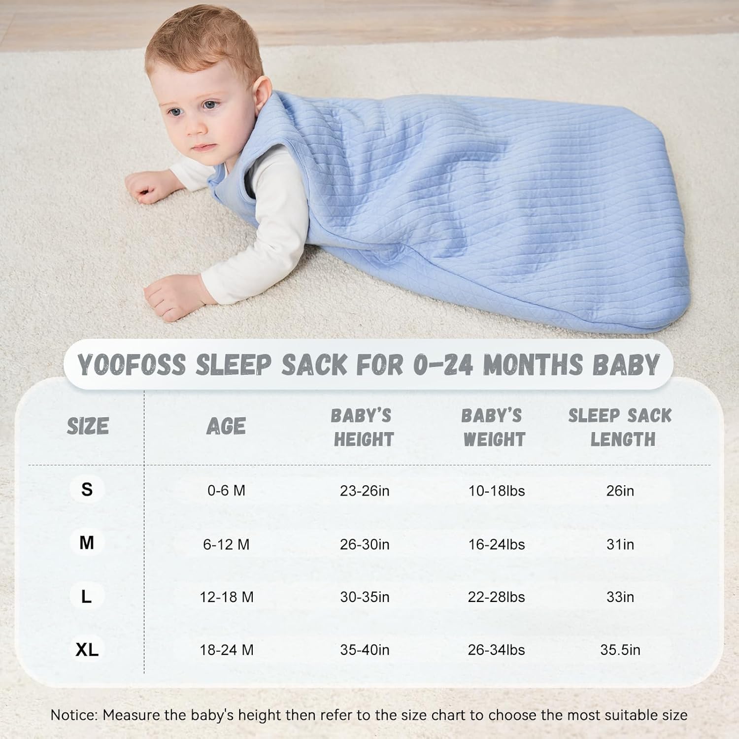 • Warm Tip: The winter sleep sack can be inner-layered with warmer sleepwear for chiller temperatures and suitable for room temperatures 61°F- 68°F . There are 4 sizes available for your choices: S(0-6Months/10-18lbs), M (6-12 Months/16-24lbs), L(12-18 Months/22-28lbs), XL(18-24 Months/26-34lbs).Please refer to our size chart carefully before you order our wearable blanket baby.